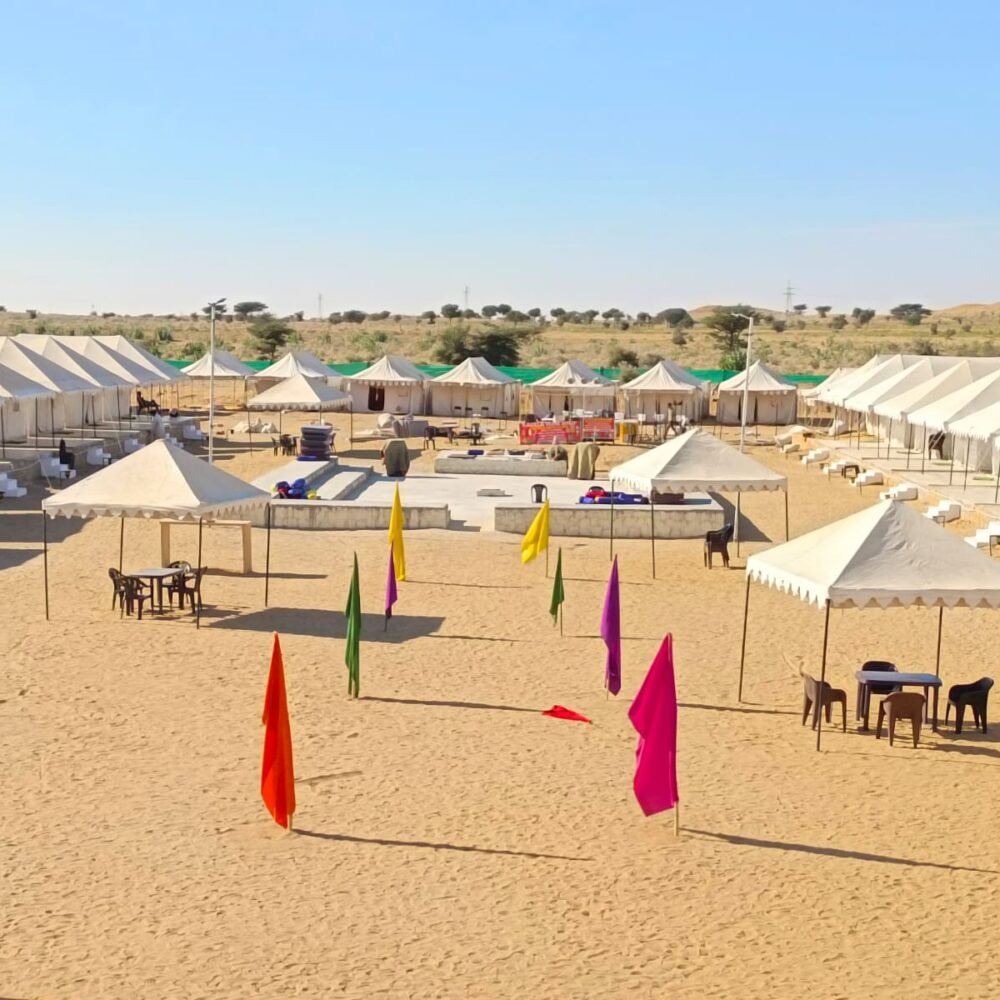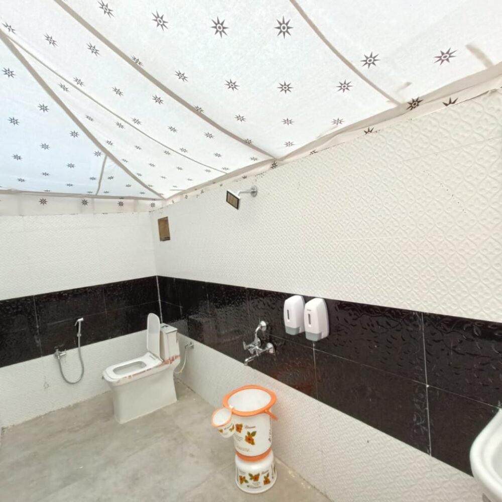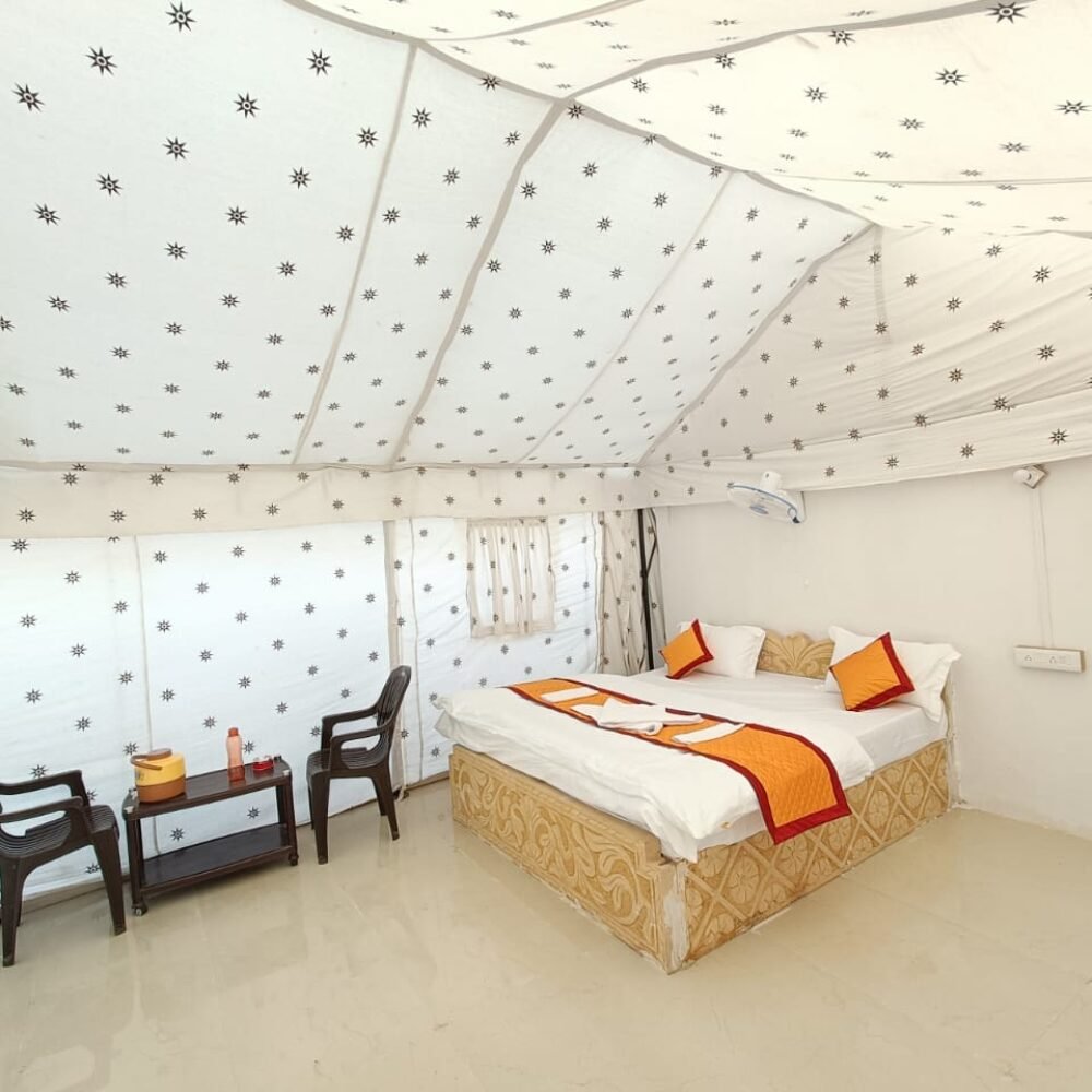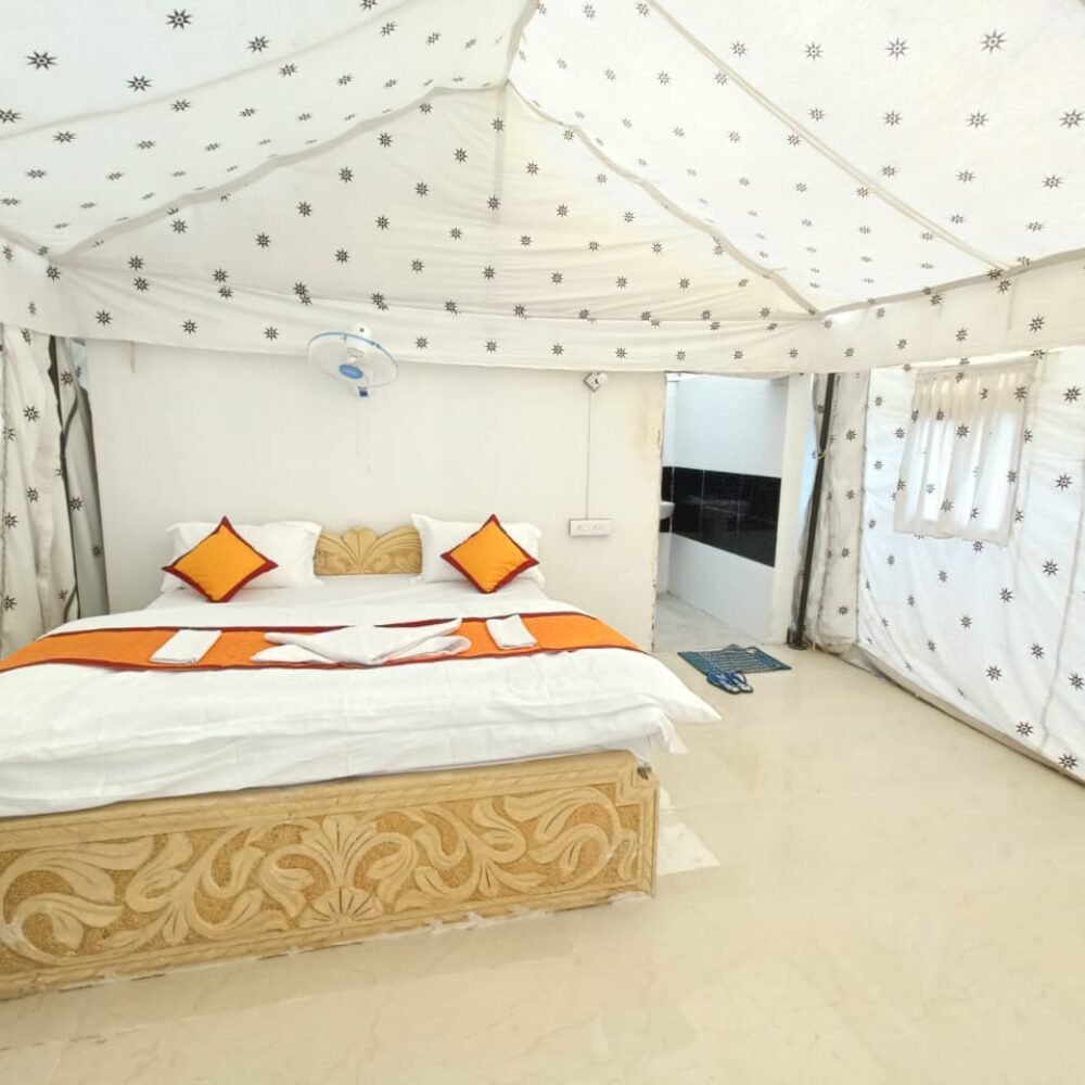 The Deluxe Swiss tents provided by Desert Sunshine Resort are highly comfortable and affordable. The tent is made up of premium quality fabric for weather resistance. All the furniture is made of high-class wood and intricately carved out to bring out the classical era inspiration. Side tables, center tables, wardrobes, and chairs, are all provided in your camp. Every tent has an attached bathroom with good quality sanitary facilities. These Swiss Tents are 450 sq. ft air-cooled tents that can accommodate 2 adults comfortably. Our Jaisalmer Camp Package includes free breakfast and dinner, camel safari, and a cultural night with DJ Party. So make the best out of our Desert Camp in Jaisalmer and leave nothing but your footprints.